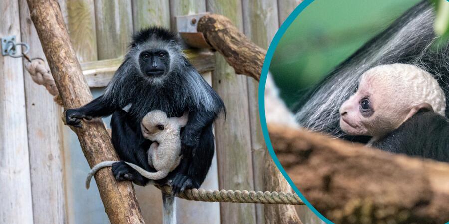 The newborn can be seen clinging closely to Ivy in the Monkey Heights exhibit, her bright white coat making her easy to spot. King colobus monkeys are born entirely white. As they grow, their colouring gradually changes.